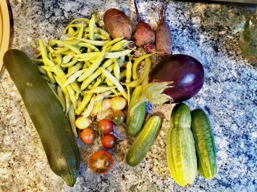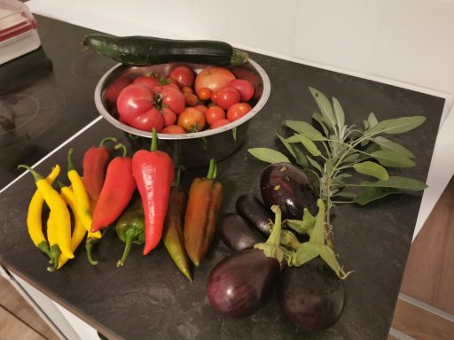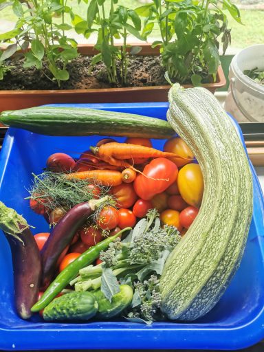Der Garten ist bunt und bringt eine orangene Farbe dazu. Zum Sommergemüse gesellt ich der Hokkaidokürbis, Sellerie, Auberginen, die zweite Ladung verschiedener Kohlsorten, Mangold und Spinat. Eine Fülle an Farben und Geschmack.