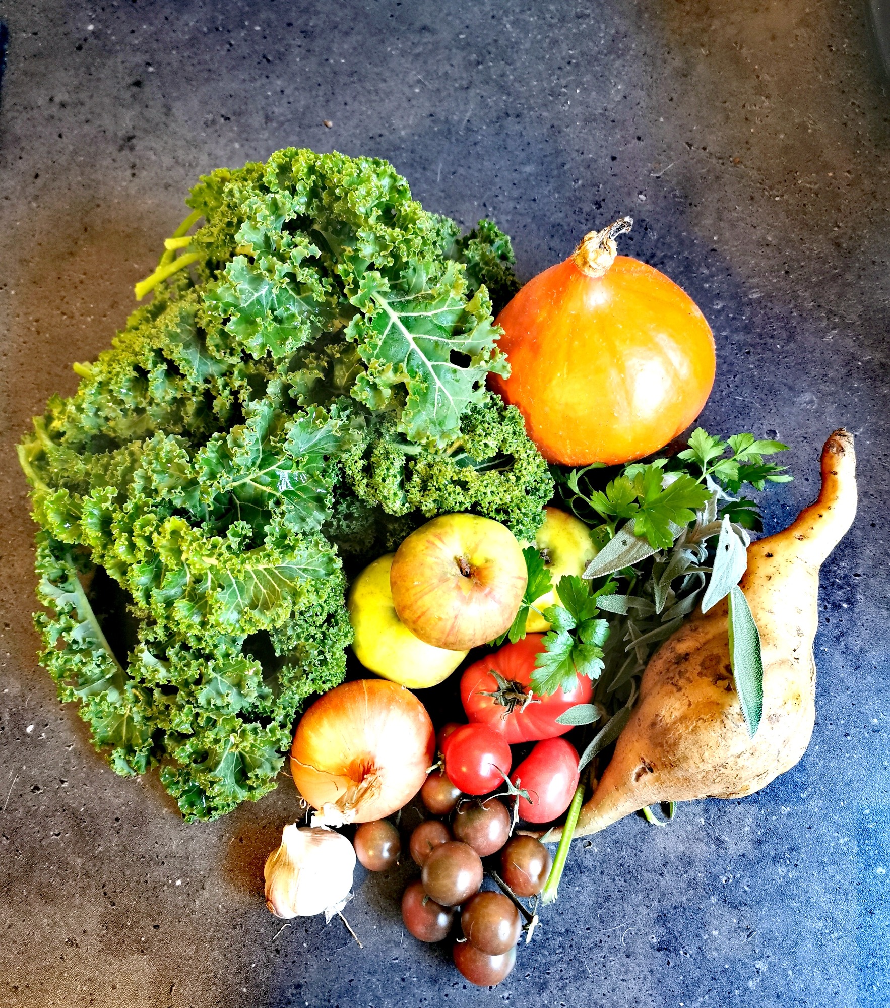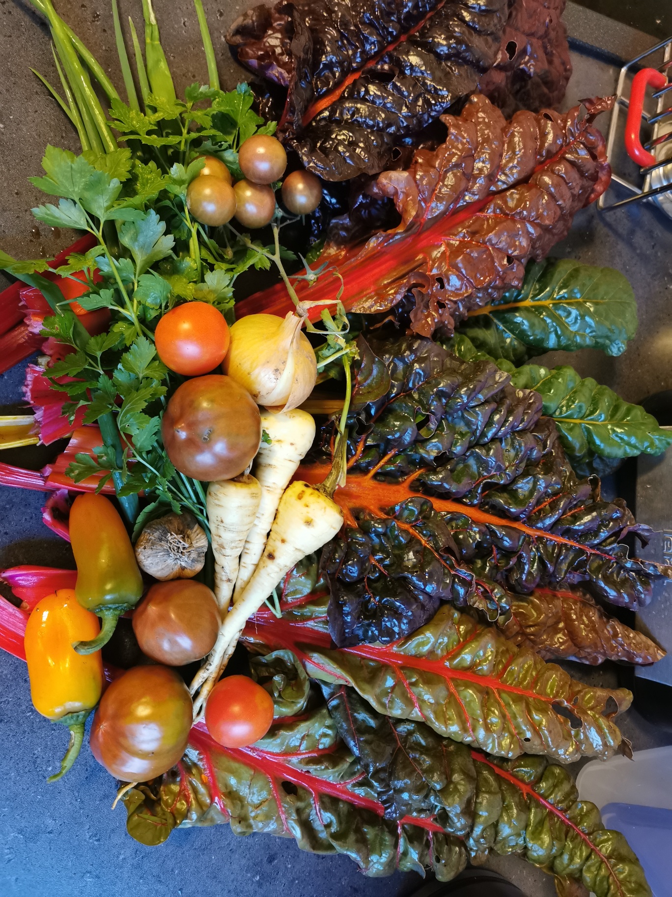 Der Garten ist bunt und bringt eine orangene Farbe dazu. Zum Sommergemüse gesellt ich der Hokkaidokürbis, Sellerie, Auberginen, die zweite Ladung verschiedener Kohlsorten, Mangold und Spinat. Eine Fülle an Farben und Geschmack.